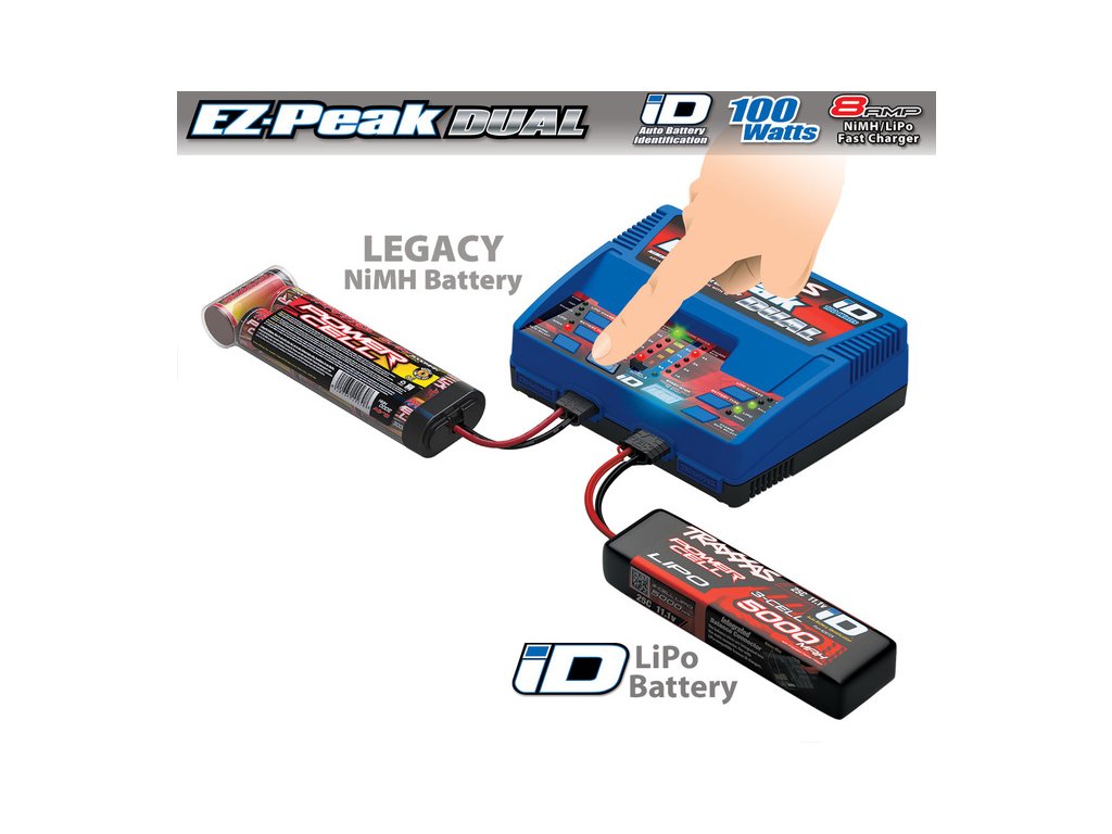 Nový systém Traxxas iD je nejjednodušší způsob, jak nabíjet baterie do RC modelů aut! Díky dnes zcela běžné technologii RFID nabíječ identifikuje připojený typ akumulátoru a sám nastaví parametry nabíjení. Pouze zapojíte Traxxas akumulátor s iD konektorem a nabíječ Traxxas EZ-Peak Plus udělá práci za Vás! Nabíjení akumulátorů je velmi jednoduché a zvládne jej opravdu každý. Díky duálnímu výstupu můžete nabíjet nezávisle až 2 akumulátory, nebo můžete výstupy spojit dohromady a nabíjet jeden akumulátor proudem až 8 A (režim fast charge)!
