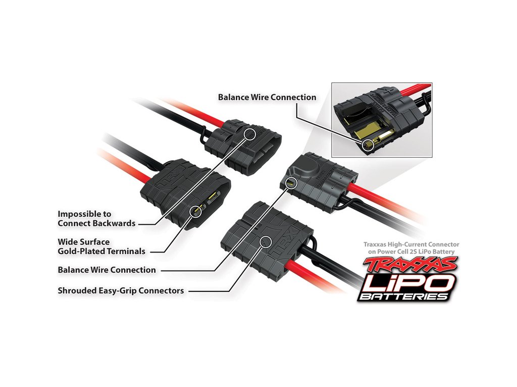 Nové konektory iD Traxxas jsou stejné pro LiPol i NiMH. U LiPol je balanční konektor integrován do silového. Odpadá tedy nutnost připojit zvlášť silový a balanční konektor.